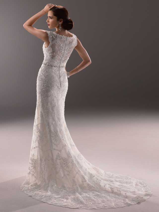 The bride searching for the loveliest lace will fall in love with this sheath dress, comprised of a separate Rosario Crepe Back Satin slip and lace overlay, ornamented with hand-placed lace motifs. Highlighted with an illusion bateau neckline and thin Swarovski crystal waistband. Finished with button over zipper back closure.