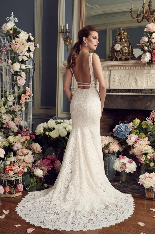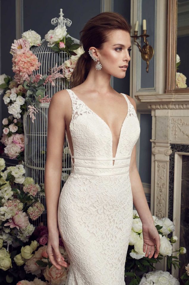 Mikaella Lace Wedding Dress. Mikaella Lace gown with plunging neckline and multiple thin bands across midriff. V-shaped Italian Tulle inserts at side seams on sleeveless bodice. Fit and flare skirt with scalloped edging at hem