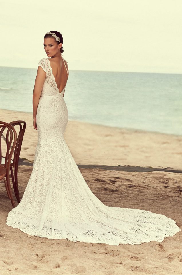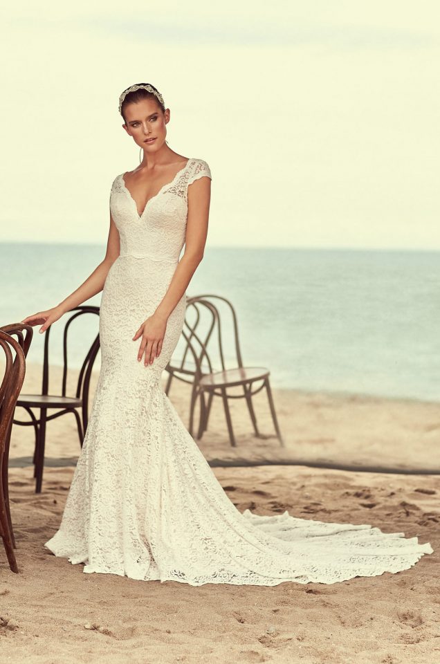 Mikaella Lace Wedding Dress. Mikaella Lace V-neckline bodice with cap sleeves. Scalloped lace around neckline, sleeve, and waist. Fit and flare lace skirt with scalloped hem