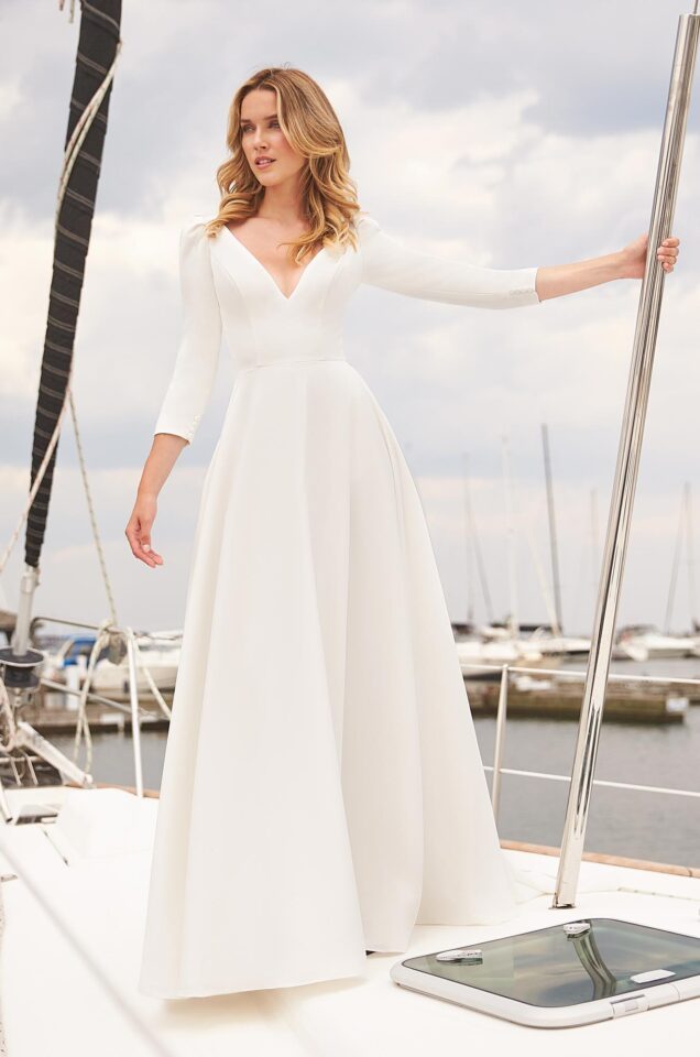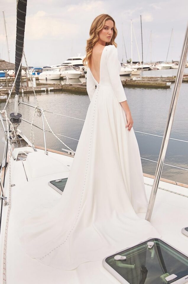 Crêpe Wedding Dress. Crêpe bodice with V-neckline, ¾ length cap sleeves. Fabric covered buttons and loops closures on sleeve hem. Full Crêpe circle skirt with pockets and fabric covered buttons down center back of skirt to hem.