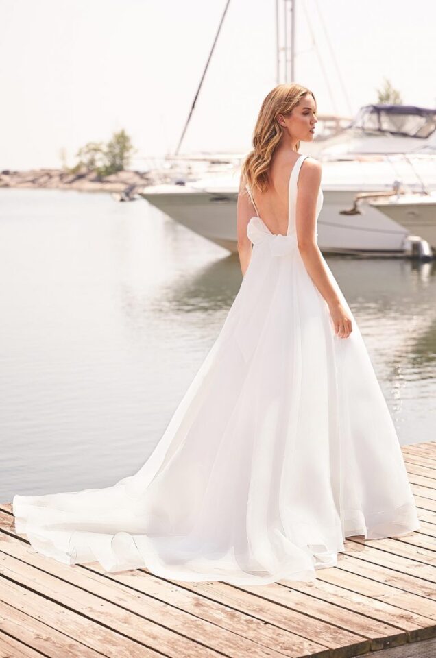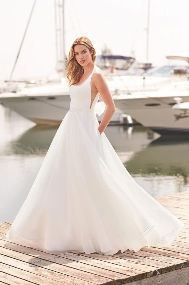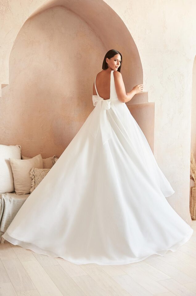 Crêpe and Organza Wedding Dress. Sleeveless Crêpe bodice with square neckline and V-shaped Nude Italian Tulle side inserts. Removable Organza sash with beading at waist and self-tied bow at back. Organza skirt with pockets and 4” horsehair at hem.