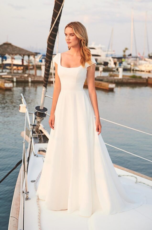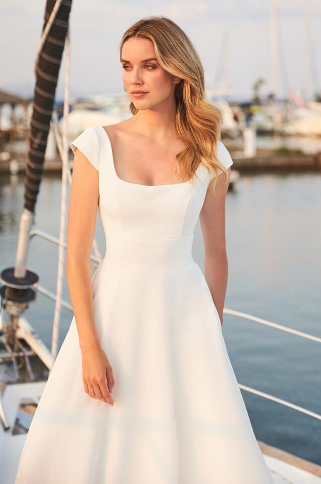 Gorgeous Square neckline and cap sleeves with beautiful fabric covered buttons on the back
