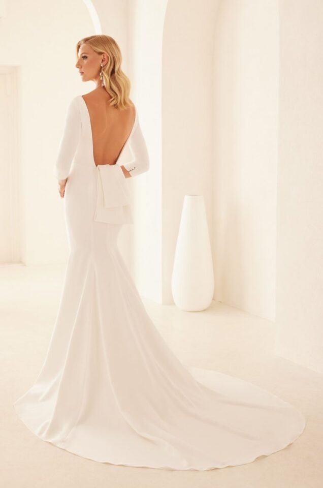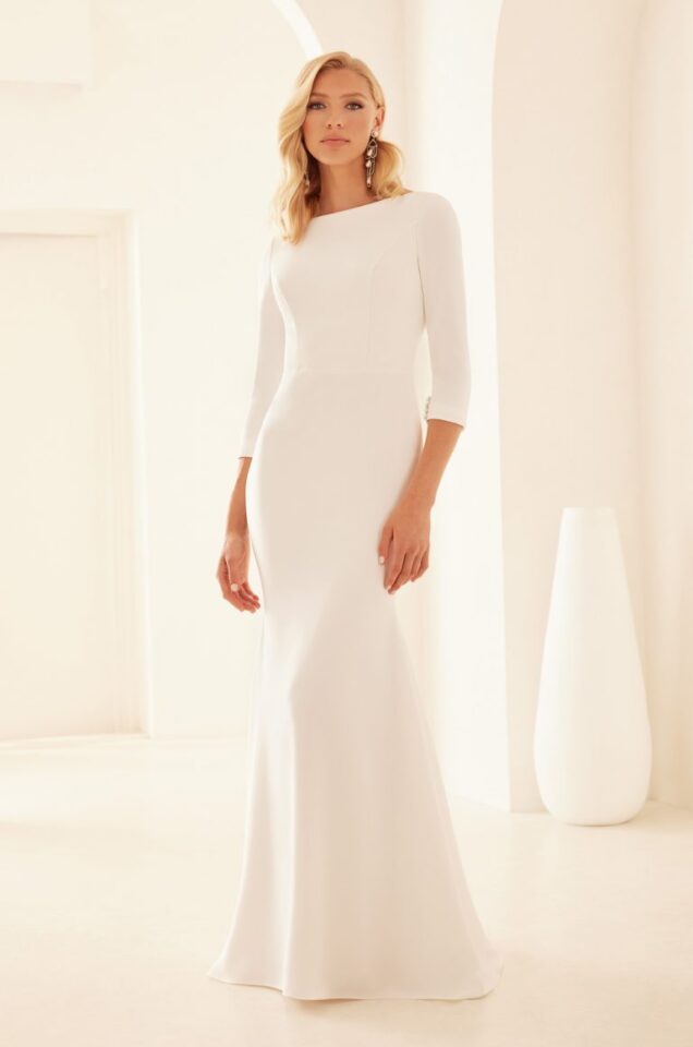 Crêpe Wedding Dress. Crêpe bodice with bateau neckline and ¾ length sleeves. Fabric covered buttons and loop closures on sleeve hem. Removable Crêpe bow at back. Fit and flare Crêpe skirt.