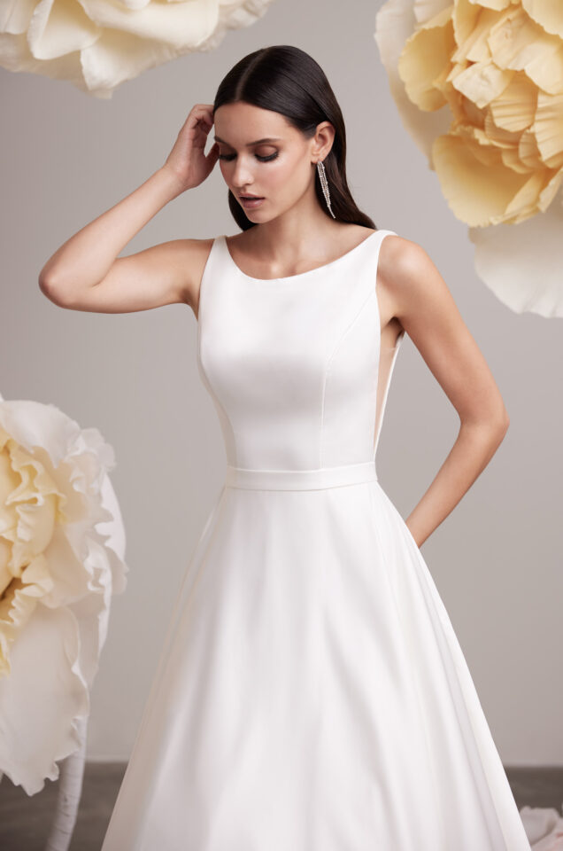 The bateau front neckline and open square low back of the Mikaella Duchesse Satin bodice creates an alluring silhouette. Delicate Nude Italian Tulle side inserts and a fabric belt at the waist add an enchanting touch. The full Mikaella Duchesse Satin skirt features pockets and a removable bow, culminating in a captivating design.