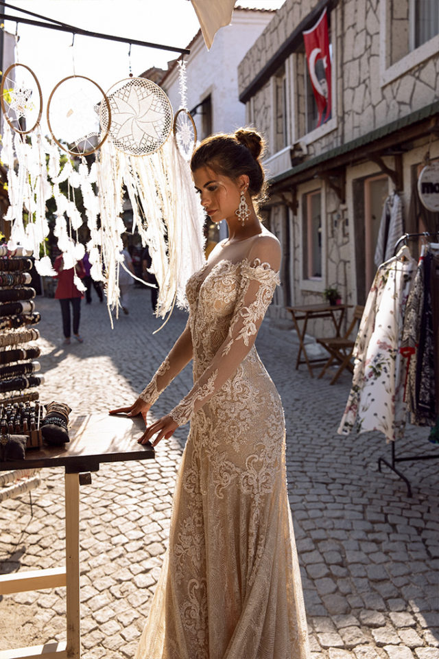 Translucent fitted dress with sleeves, zipper and buttons on the back. Corset with cups, shoulder mesh belt. The dress is decorated with textured appliques of lace, which passes on the decorative straps. The dress is embroidered with beads. Skirt with 40cm train, trimmed with regilin.