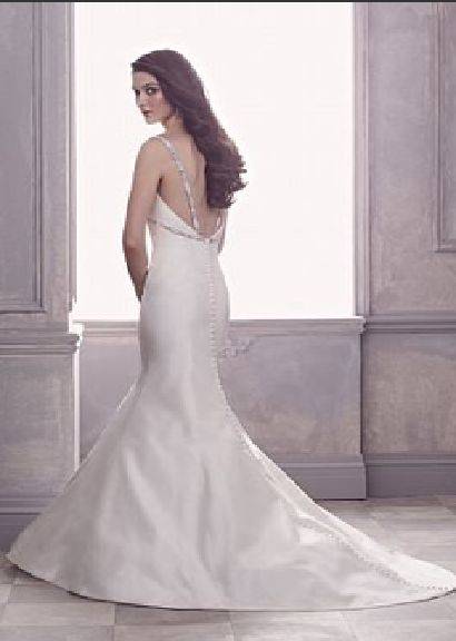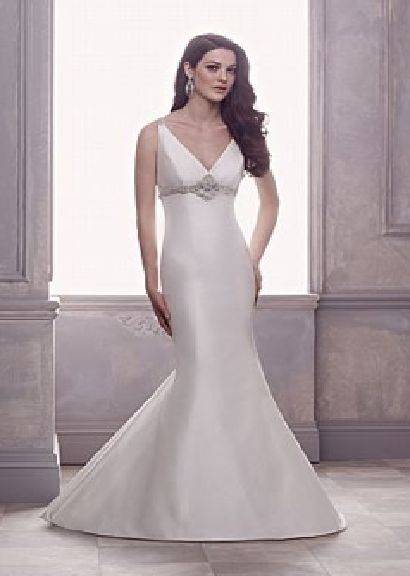 Silk Dupioni Wedding Dress. Cross-over v-neckline empire bodice with beading on shoulder straps and empire. Fit and flare skirt. Covered buttons over zipper to hem. Sweep Train.