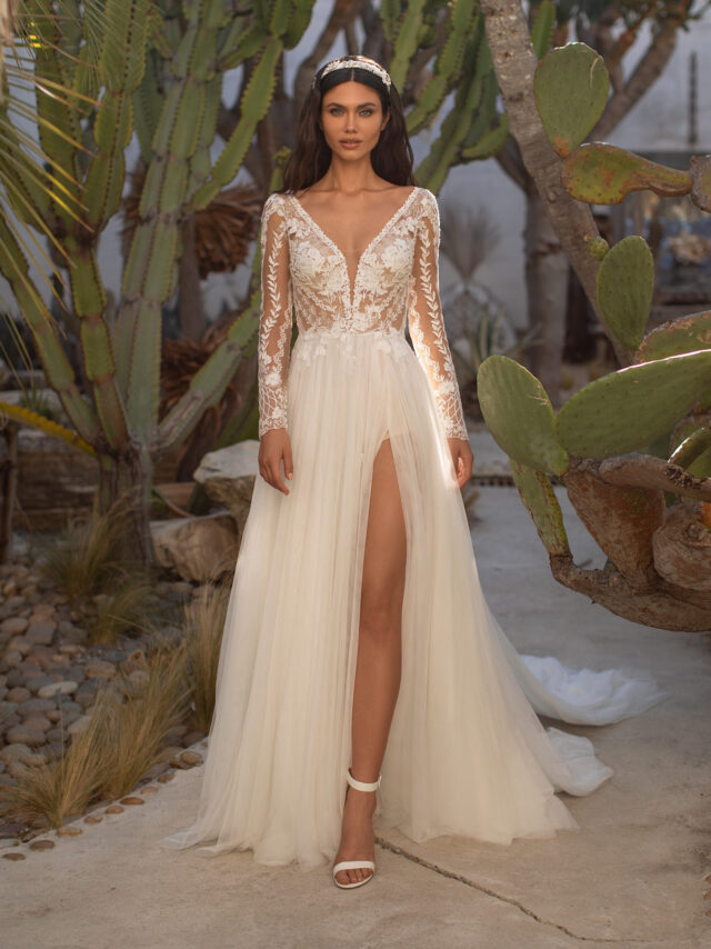 Flowers and branch sprigs in divine handmade lace are placed on a nude bodice, creating stunning effect on the cleavage, back and sleeves. The full tulle skirt features a sensual, thigh-high split.