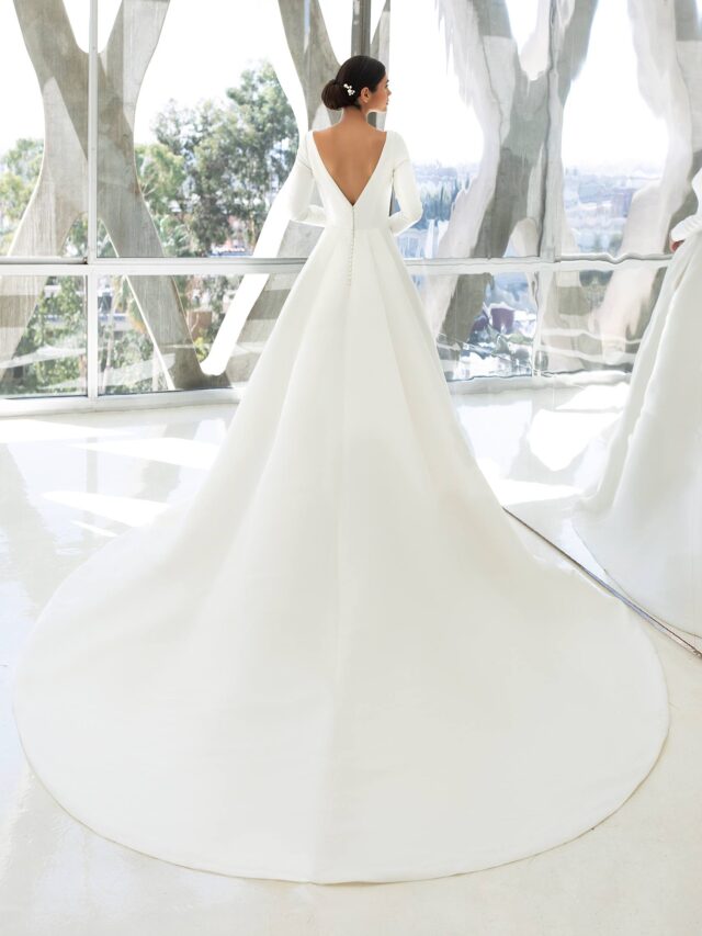 As the name suggests, this chic Mikado wedding dress emits timeless elegance with its flattering fitted sleeves, exposed back and deep V neckline with stunning beading