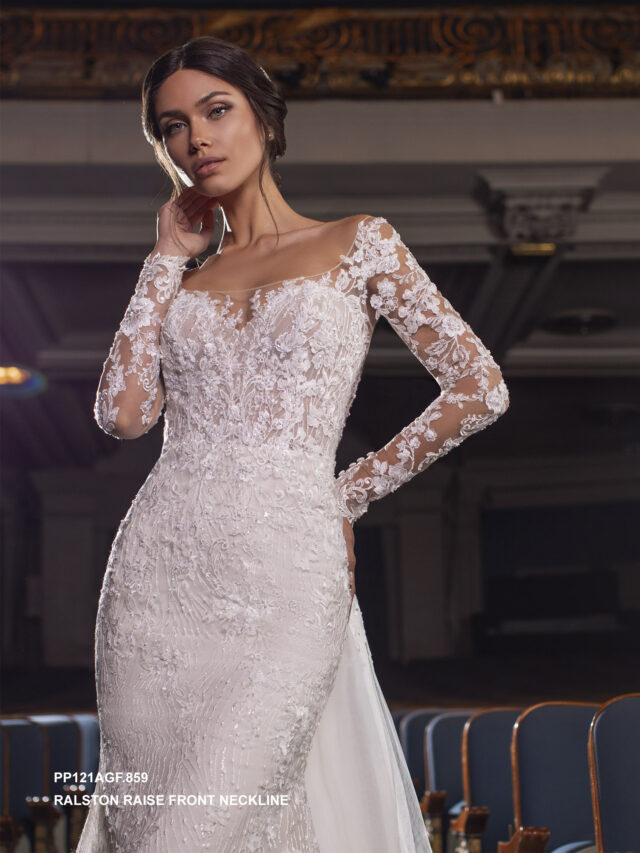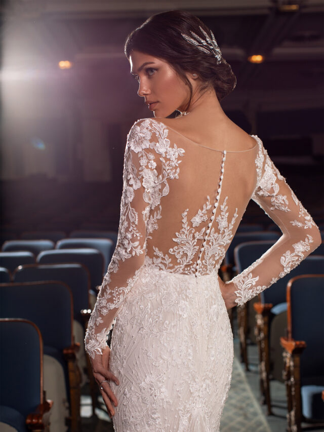 A fitted mermaid style dress wraps the body in exquisite lace and highlights arms, shoulders and back with a beautiful tattoo effect. A detachable cathedral train transforms the look, taking you from church to reception-ready.