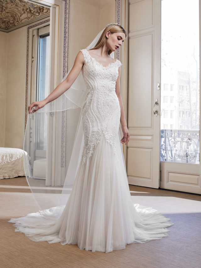 This gown features a creamy mosaic of lace that blossoms along the cap sleeves and bust before streaming down the upper skirt and clustering at the edge of the softest tulle mermaid train.
