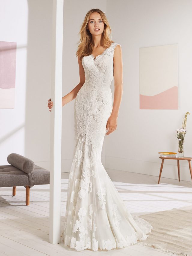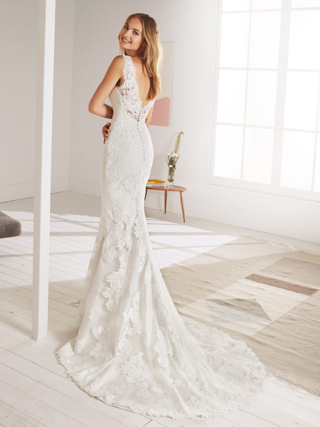 Romanticism inspired this amazing mermaid wedding dress in tulle and lace. A design where the flowers and details make the difference and accentuate the femininity of the forms: