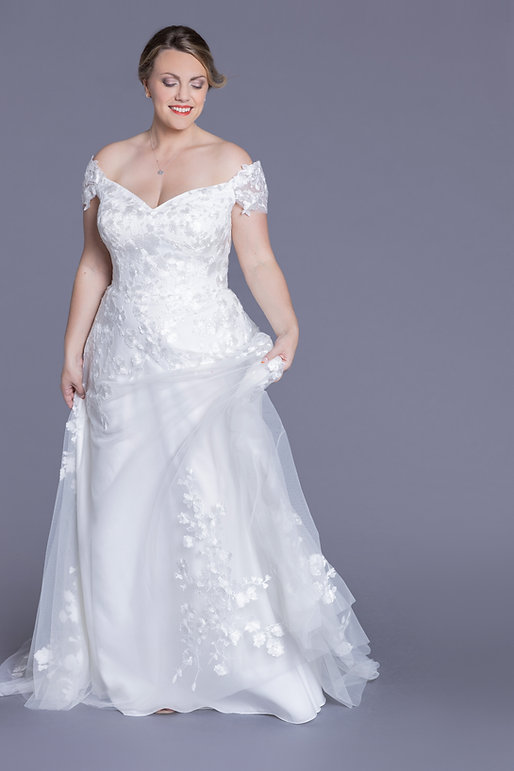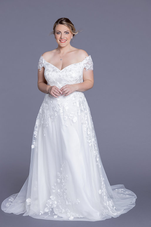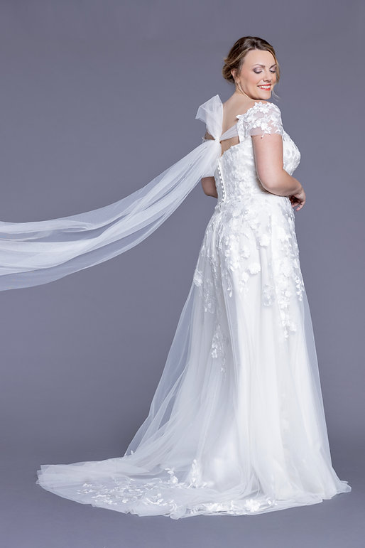 Stunning lace A-line dress with a gorgeous tie back detail and chiffon ribbon that trails down the back of the dress.