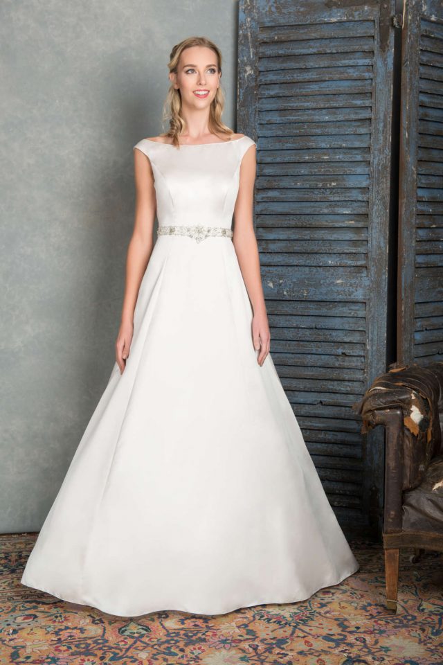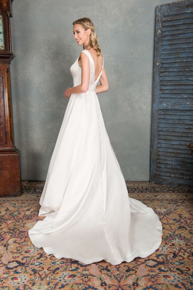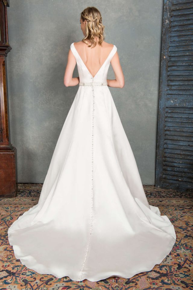 A-line satin high neck elegant wedding dress. Stunning open back. Beaded band around waist line.