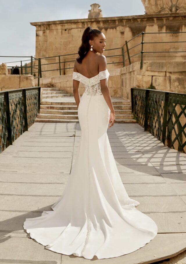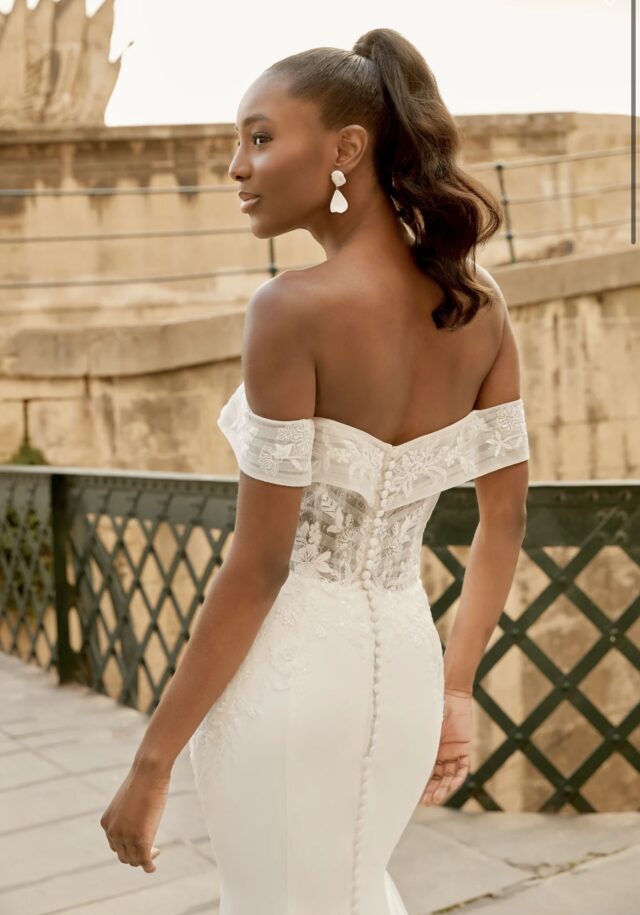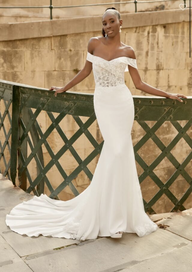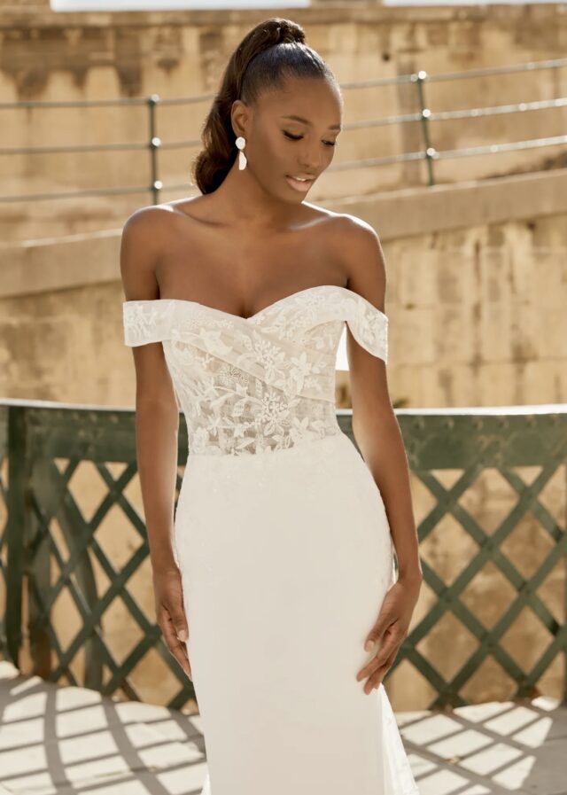 Lace and Crepe Fit and Flare with Off-The-Shoulder Portrait Neckline