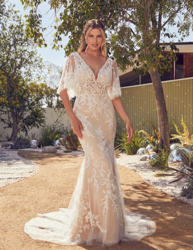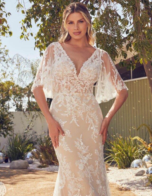 Introducing Style BL400 Honey by Beloved. As sweet as her namesake, this demure fit and flare dress is perfect for the blushing bride craving an undeniably romantic and feminine wedding day ensemble. Delicate floral overlace with generous beading and sequins are placed throughout the gown, while an exposed bodice reveals the perfect amount of skin. Honey's lace flutter sleeves are reminiscent of vintage glamour, evoking visions of classic romanCe.