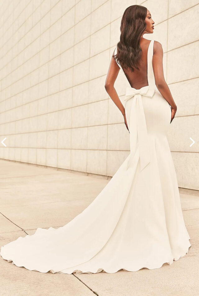 Crepe Wedding Dress. Sleeveless Crepe gown with bateau neckline and V-shaped Nude Italian Tulle inserts under arms. Detachable bow and sashes at center back. Fit and flare Crepe gown with princess seams.