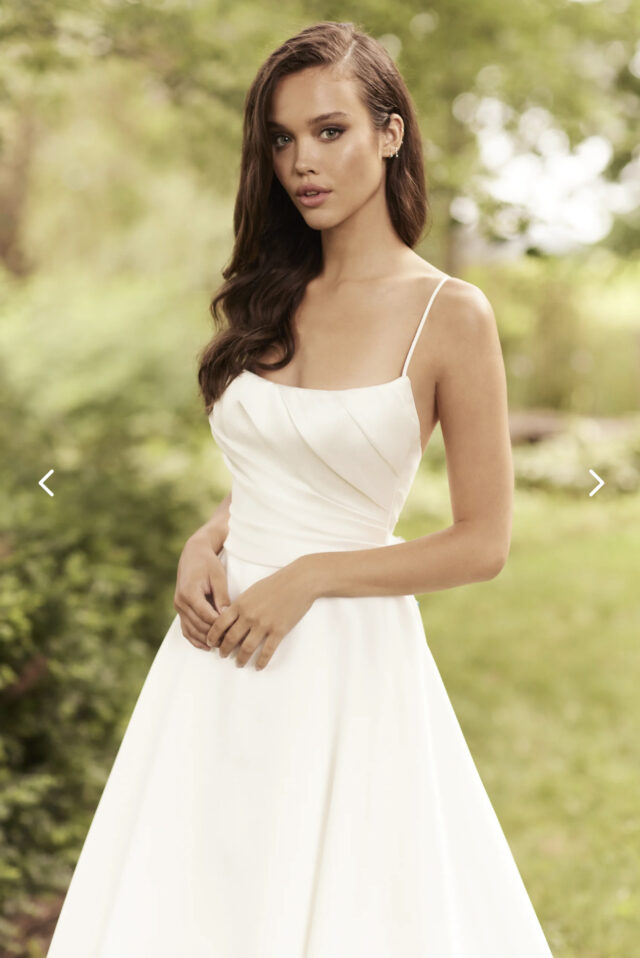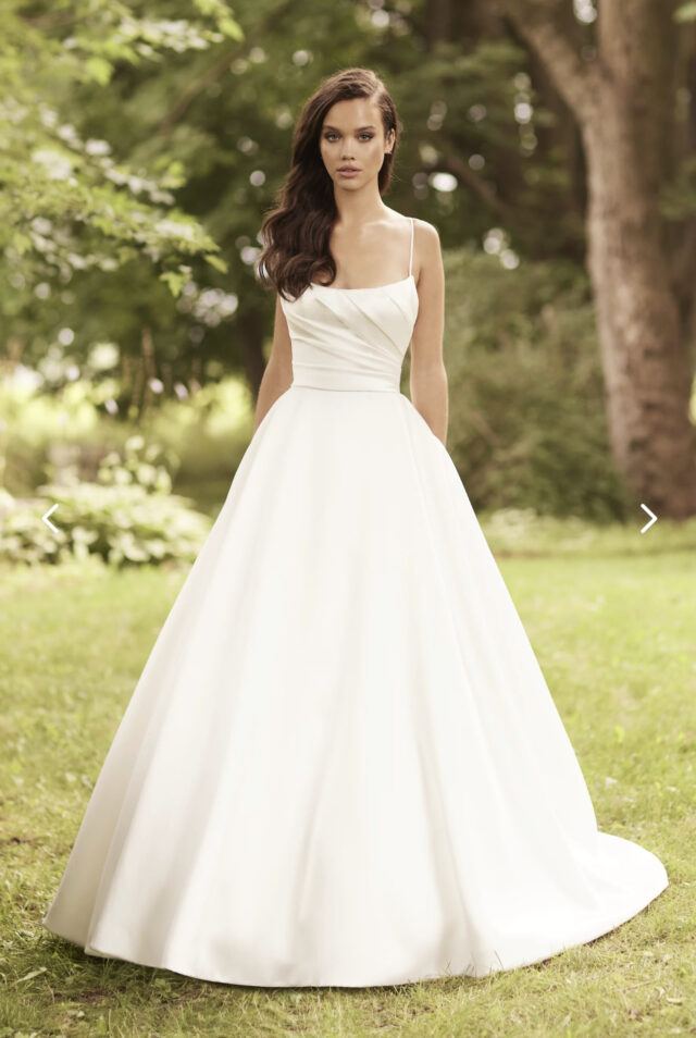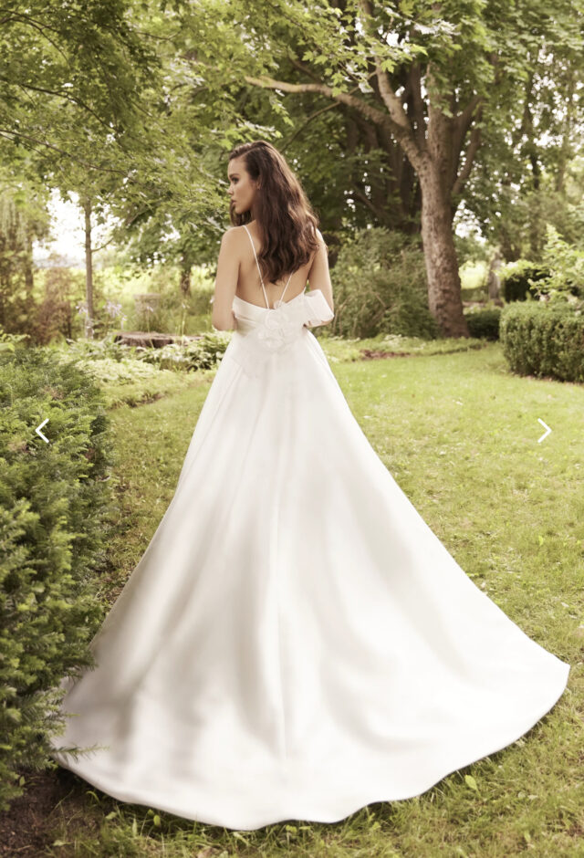 Spaghetti strap asymmetrical draped bodice with scoop neckline. Mohair bow with flower for back detail. Full Mikado skirt with pockets.