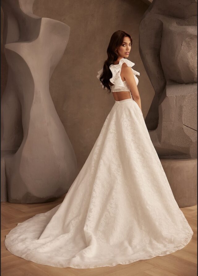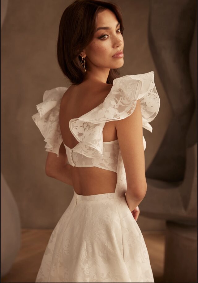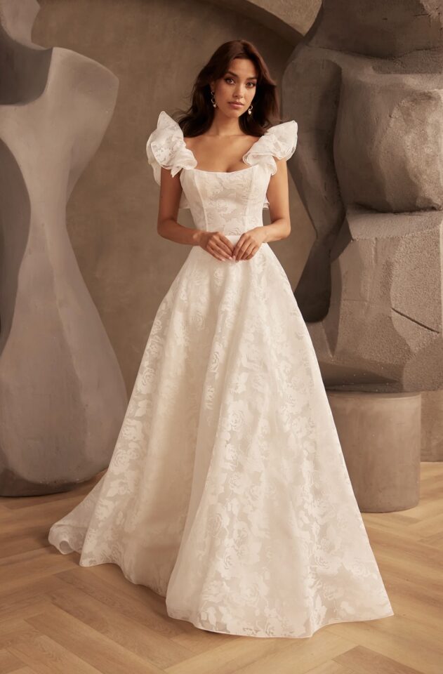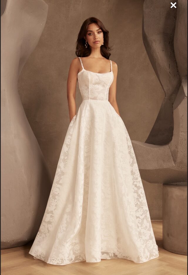 Burnout Organza Wedding Dress. Burnout Organza bodice with princess seams, slight scoop neckline, and ½" wide straps. Detachable shoulder ruffle detail. Back strap with button closure. A-line Burnout Organza skirt with pockets and 4" horsehair hem.